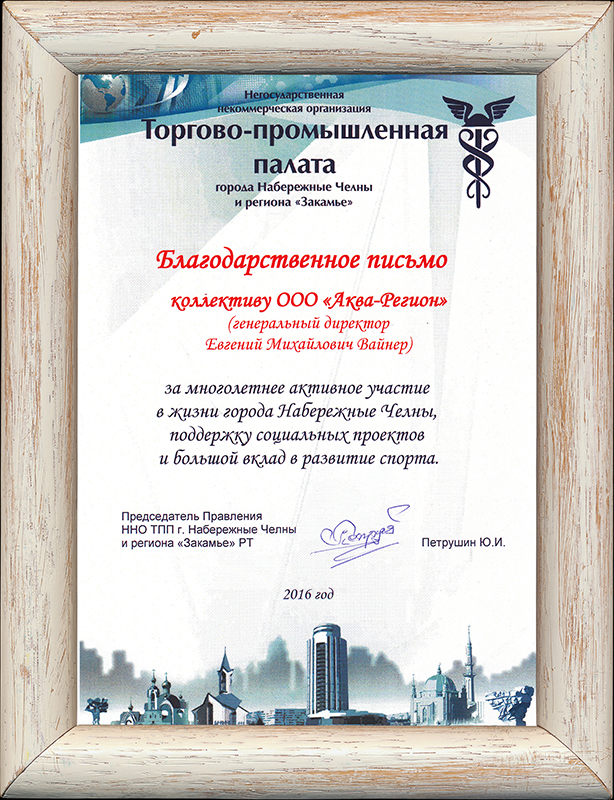 Благодарственное письмо ННО Торгово промышленная палата г. Набережные Челны и региона Закамье коллективу ООО "Аква-Регион" за многолетнее активное участие в жизни города Набережные Челны, поддержку социальных проектов и большой вклад в развитие спорта